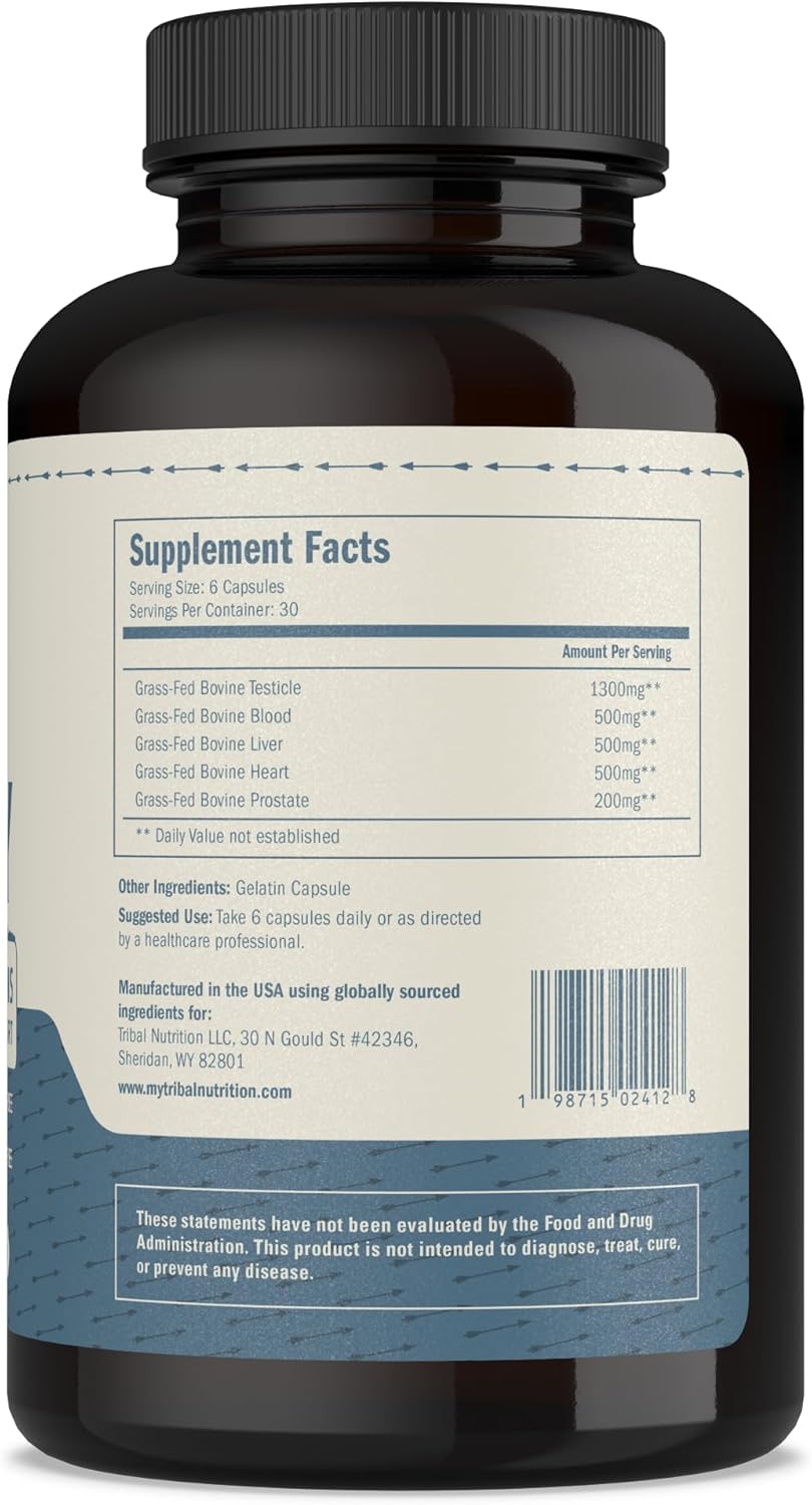 Grass fed beef organ supplement for men. Includes beef testicle, prostate, blood, liver, and heart. Desiccated organ capsules made from pasture-raised cattle. Whole food nutrients for male vitality, energy, and strength. Freeze-dried for nutrient preservation. Non-GMO, gluten-free, soy-free. Made in the USA in GMP-certified facility. Supports daily wellness and performance. Nutrient-dense ancestral supplement. Organ meat supplement for carnivore, paleo, or ancestral diet. Whole package. Contains CoQ10, heme iron, vitamin A, B12, choline, and peptides. No fillers or artificial ingredients. Convenient capsule form for daily use. Grass fed beef testicle supplement for men. Beef organs for men. Beef organ supplement for men. Beef testes.