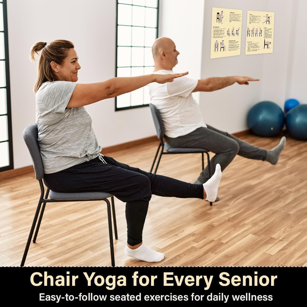 CHAIR-BASED EXERCISES: All poses and movements are performed using a chair for stability and support, ensuring safety for seniors