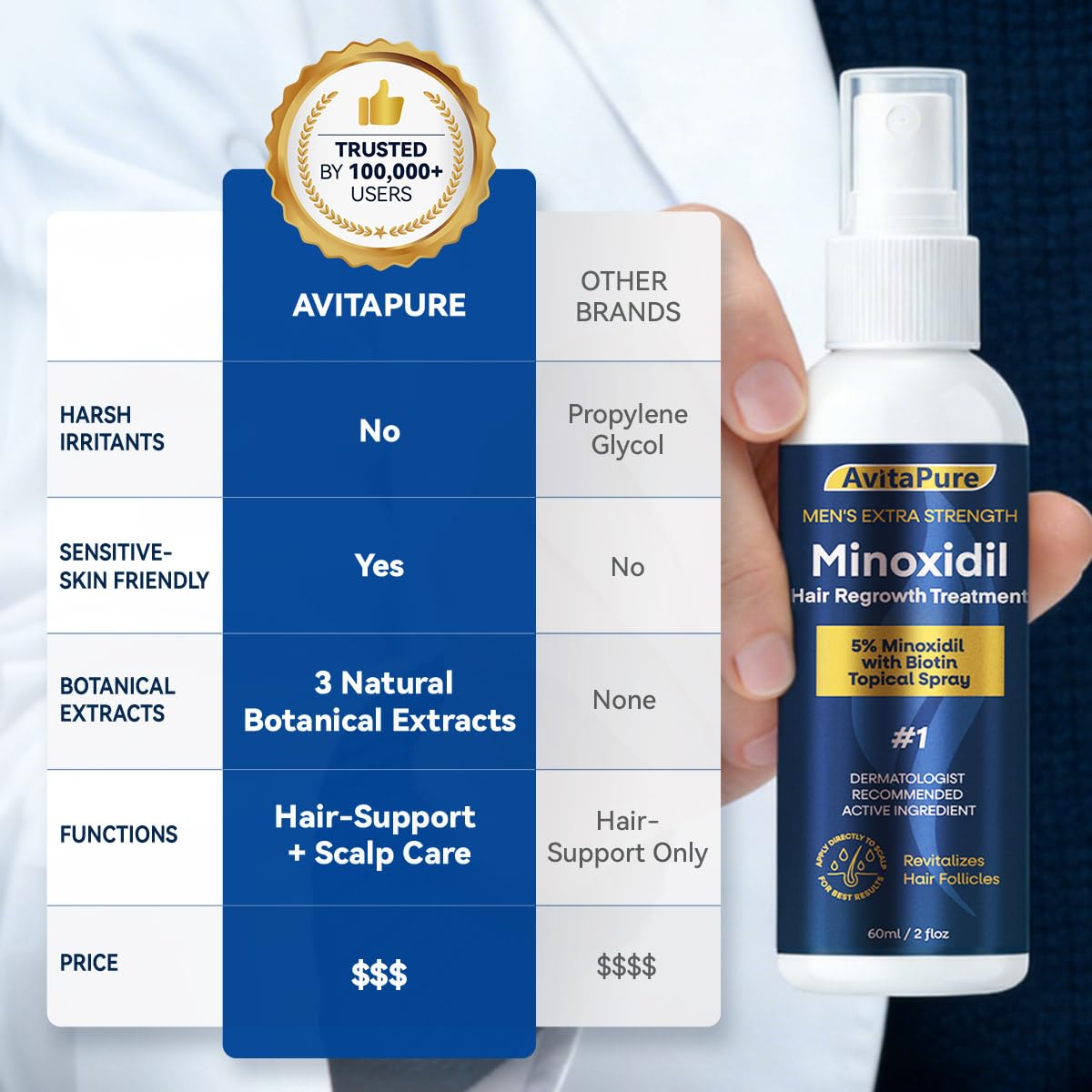 DUAL PACK & BETTER VALUE: The AVITAPURE 5% Minoxidil hair growth for men 2×2oz pack provides a full 60-day supply to maintain consistent use without interruption. The dual-bottle design offers better value and convenience—keep one at home and one for travel or on-the-go care.