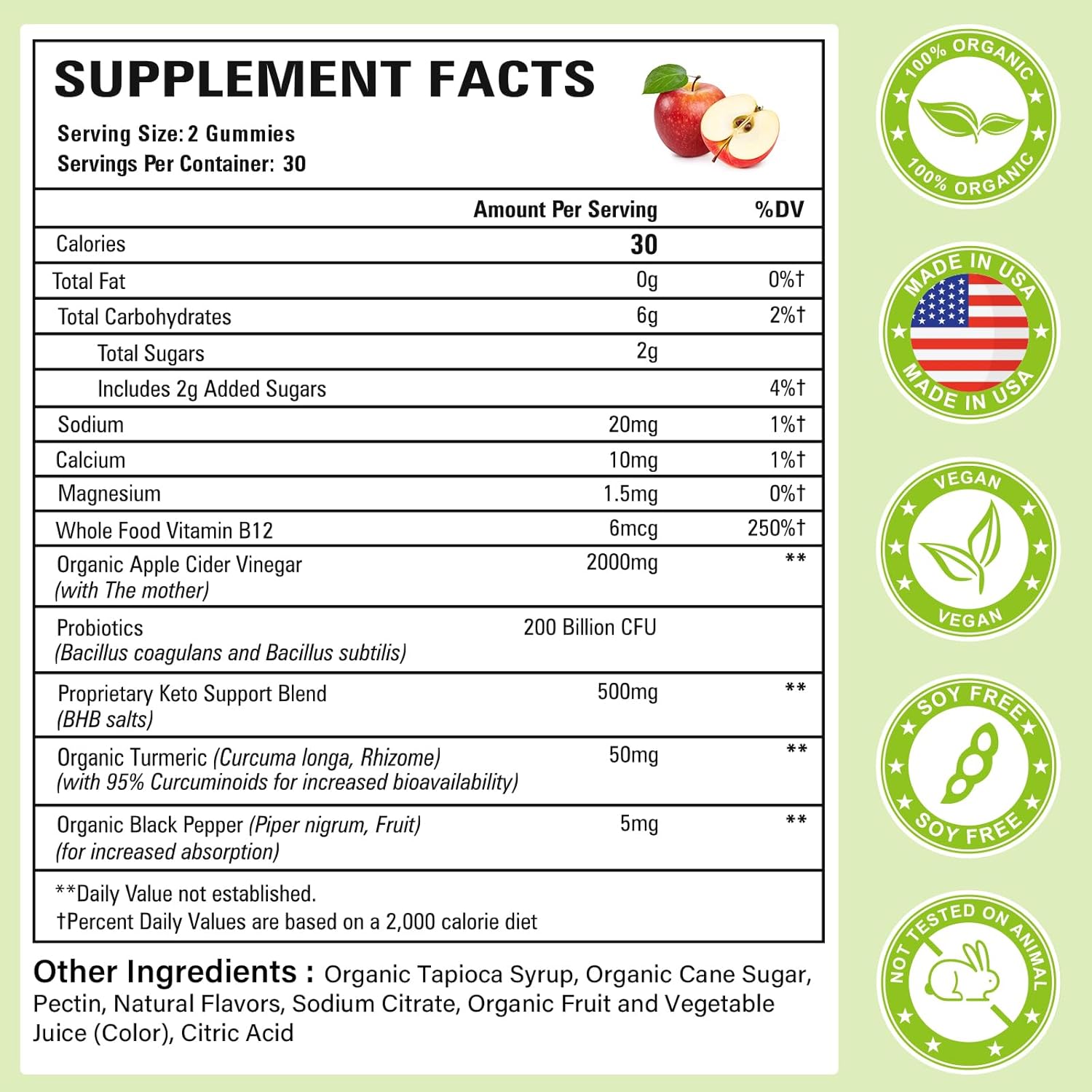 Multiple Benefits: Our specially formulated Keto ACV gummies are enriched with probiotics, vitamin B12, proprietary keto support blend, organic turmeric and organic black pepper, these powerful ingredients help with digestive issues, gut health, and metabolism