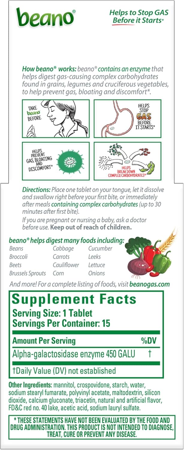 Beano gas prevention tablets contain a digestive enzyme that helps break down gas-causing complex carbohydrates found in many foods, making them easier to digest* to help prevent stomach discomfort