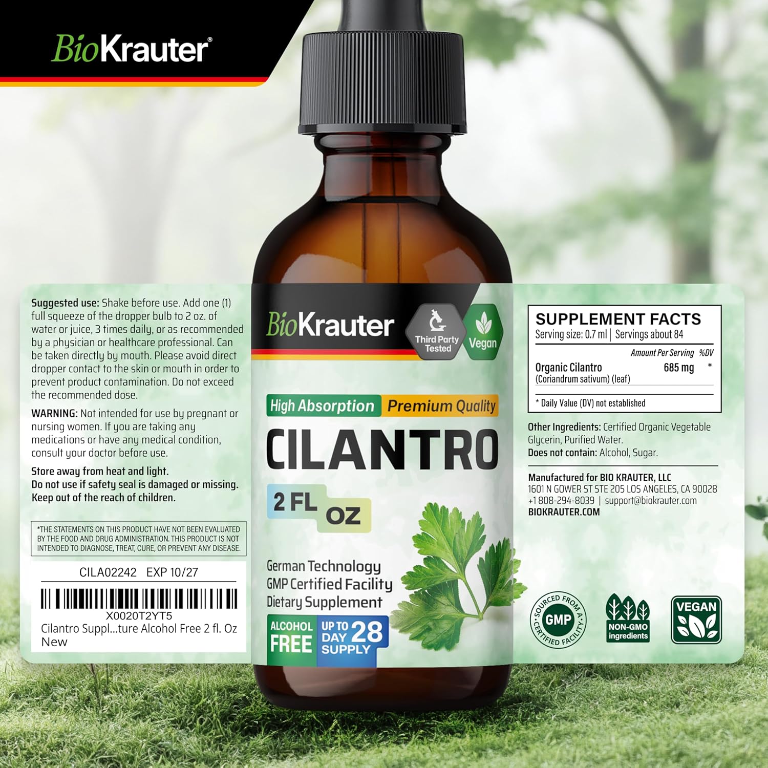 BIO KRAUTER Cilantro Supplement – Rich Source of Antioxidants – Natural Cleansing & Detox Cilantro Tincture – Vegan, Alcohol Free Drops 2 Fl. Oz.