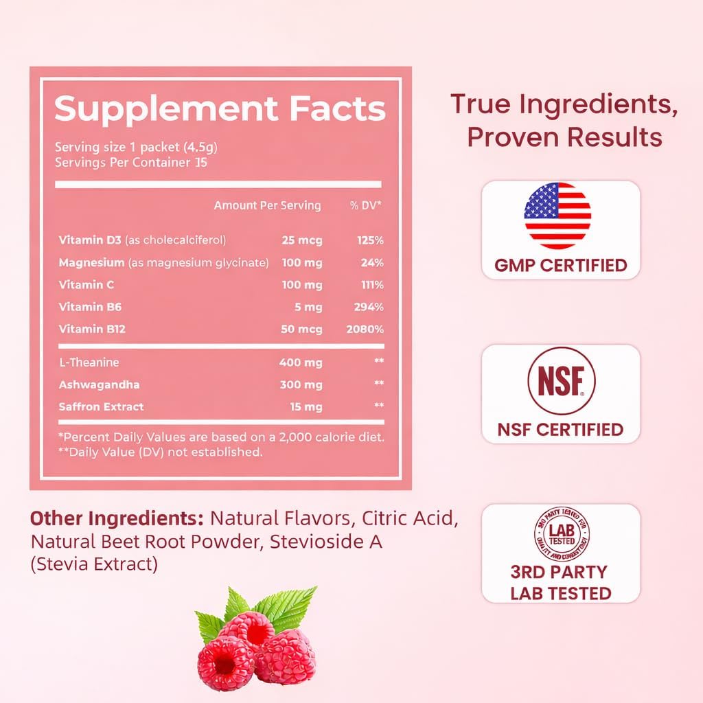 Calm Magnesium Powder Cortisol Supplement for Women, Supports Sleep, Stress Relief & Relax with Ashwagandha, Saffron, L Theanine, Vitamin D3, No Sugar, 15Ct, Raspberry Lemonade