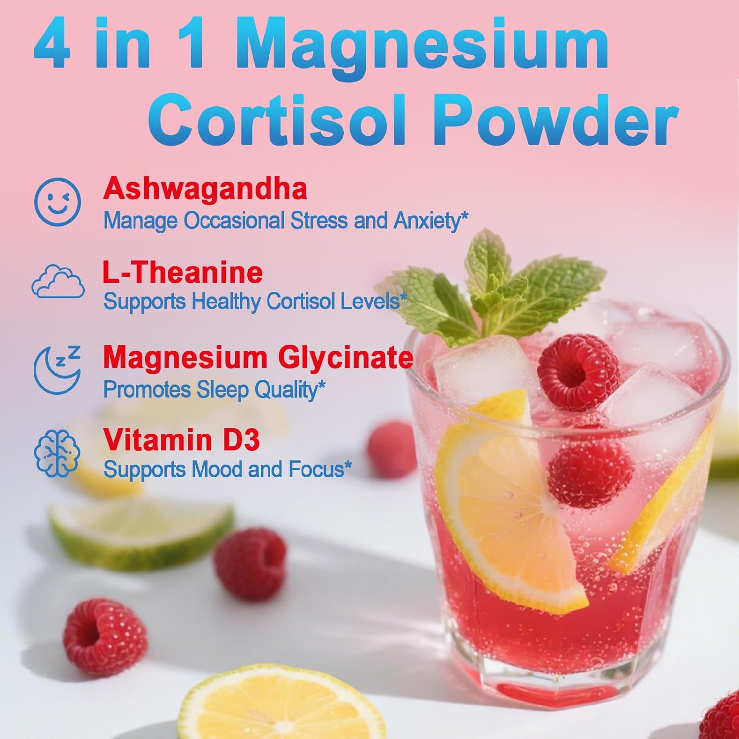 Cortisol Powdered Drink Mix, Made with Magnesium Glycinate, L-Theanine, Ashwagandha & Vitamin D3, Cortisol Supplements for Relaxation, Focus & Calm Support, Raspberry Lemonade Flavor, 30 Ct