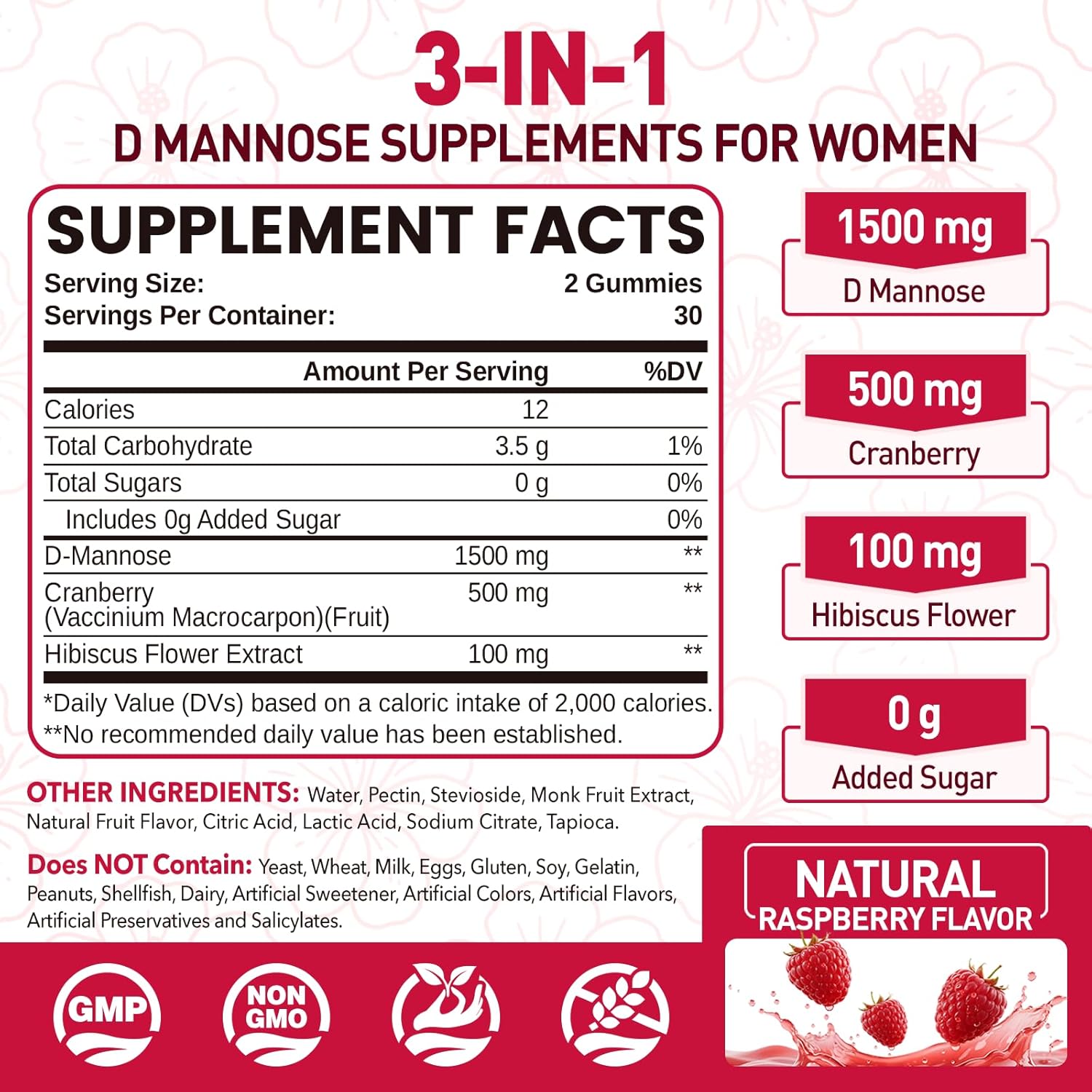 D Mannose 1500mg with Cranberry: Our d mannose gummies use a powerful blend 3-in-1, include d mannose, cranberry, and hibiscus flower. Each serving contains 1500mg of d mannose, 500mg of cranberry, and 100mg of hibiscus flower. This powerful combination supports the urinary health of women