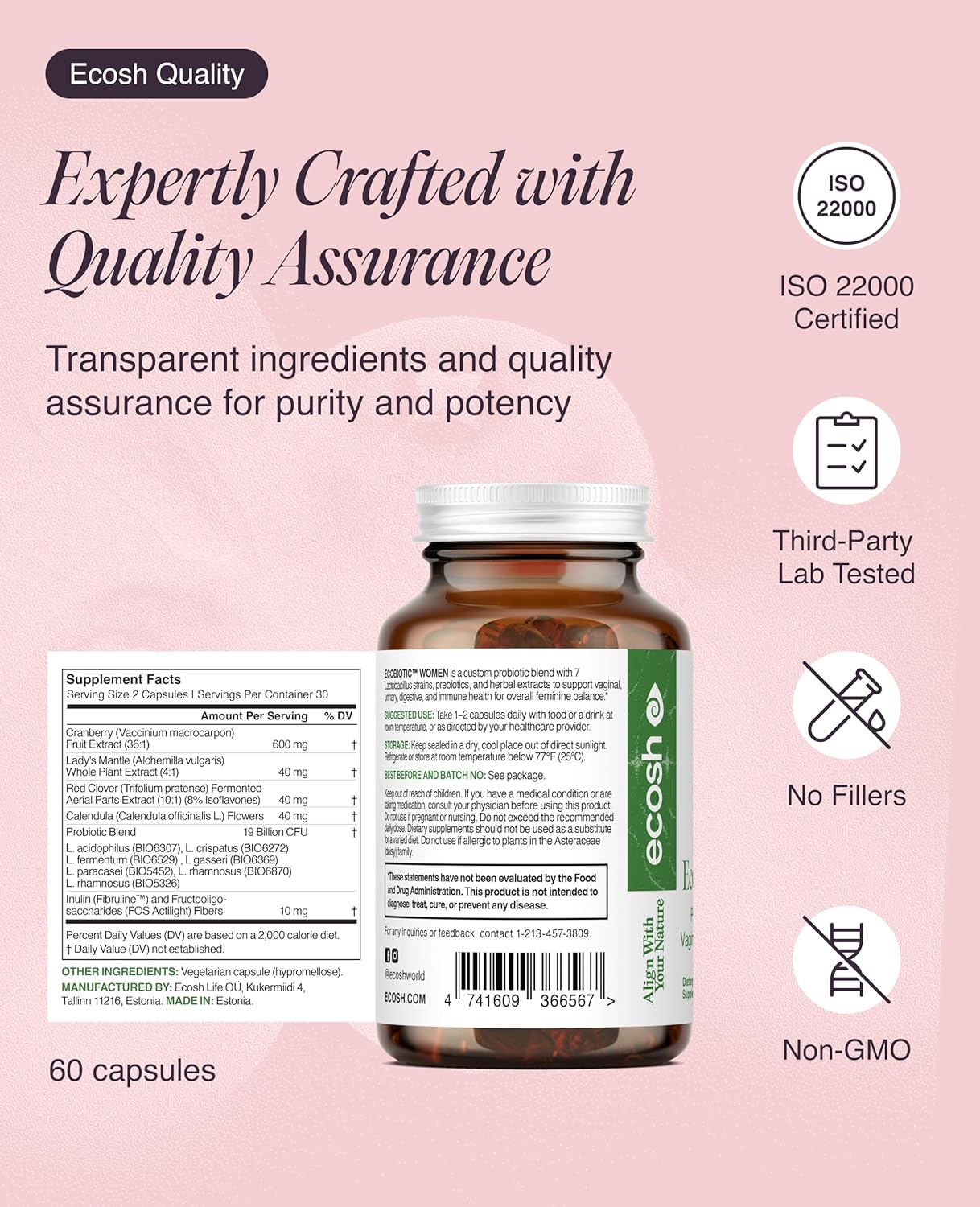 Ecosh Women’s Probiotic for PH Balance, Urinary Tract & Gut Health – Vaginal Probiotics for Women with Prebiotics, Lactobacillus Acidophilus & Crispatus, Natural Cranberry & Herbs | 60 Vegan Capsules