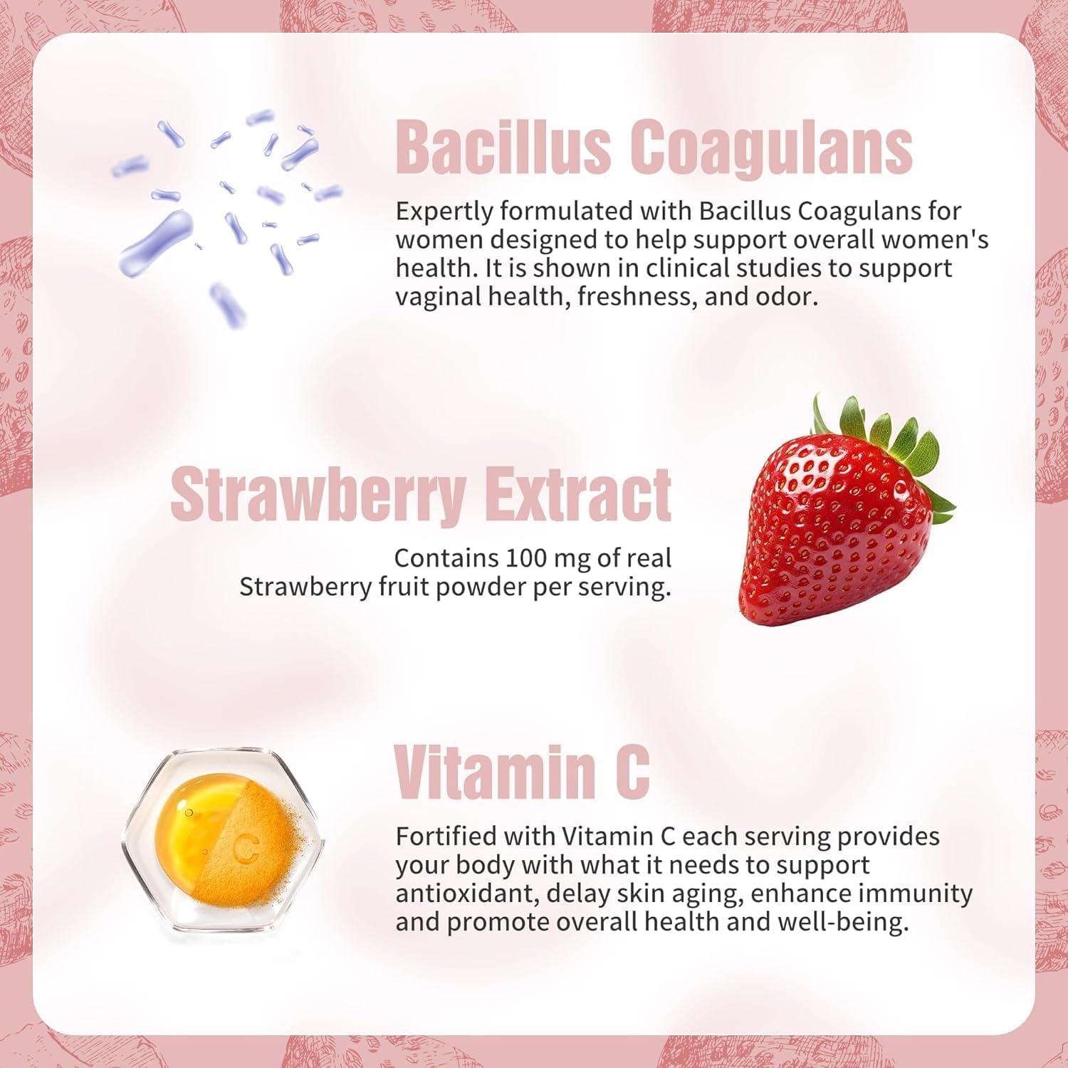 OPTIMIZE PH BALANCE – The ingredients in Probiotic helps crowd out harmful bacteria and promote pH balance for women. This convenient treat blends strawberry Fruit Powder and Bacillus Coagulans, offering a delicious way to support your pH balance and immune defense.