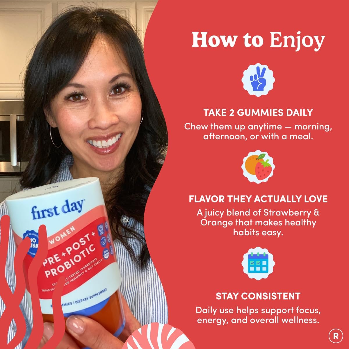 Delicious Gummies, Low Sugar: First Day gummies are delicious, made with natural flavors, and are easy to add to your daily routine. Women love that First Day has ZERO artificial sweeteners and only 2g of sugar, making First Day your favorite healthy treat.