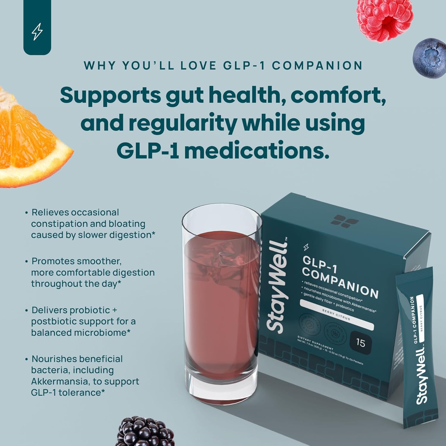 GLP-1 Constipation Support | Digestive, Gut Discomfort GLP Symptom Relief | Akkermansia, Probiotic, Prebiotic Microbiome Support for Digestive Balance, Regularity & Bloating Relief – Berry Citrus 15ct