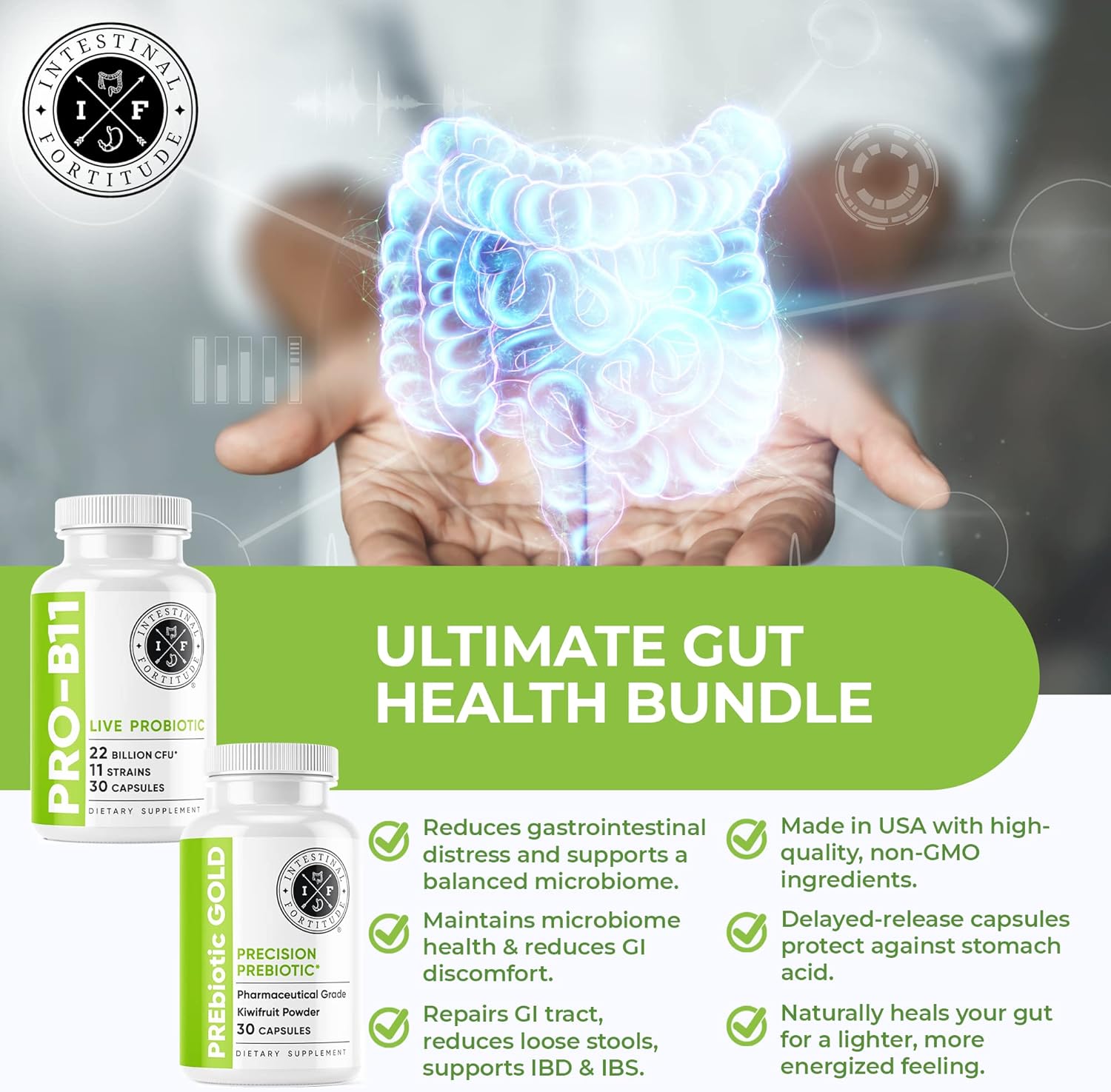 ENHANCE YOUR GUT: Intestinal Fortitude’s Prebiotic and Probiotic Gut Supplement Bundle are designed to help fortify your microbiome and nourish beneficial organisms in the digestive tract.
