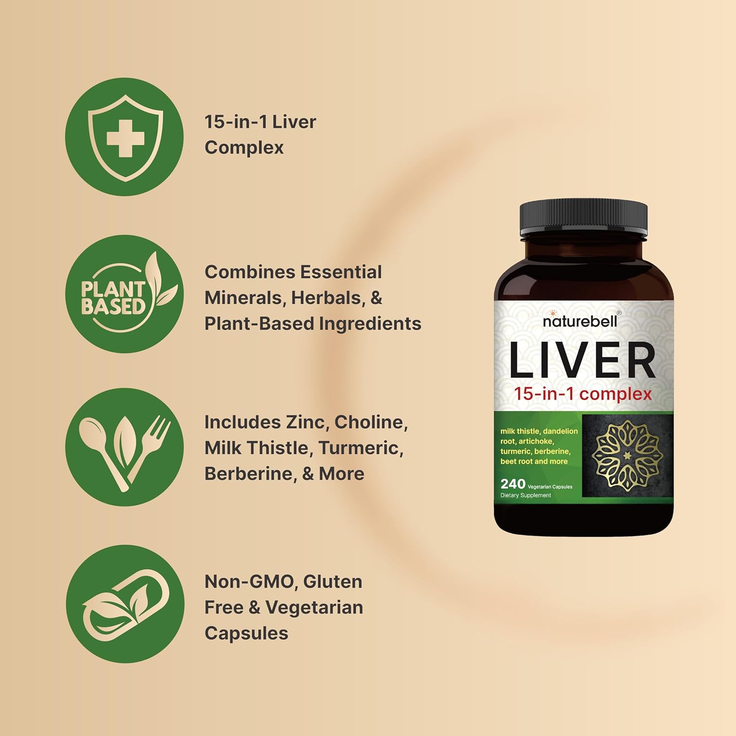 Liver 15-in-1 Complex, 240 Veggie Capsules | Herbal & Mineral Blend – Milk Thistle, Dandelion Root, Artichoke, Black Currant Oil, Turmeric, Chicory, Zinc, Choline, & More | Non-GMO