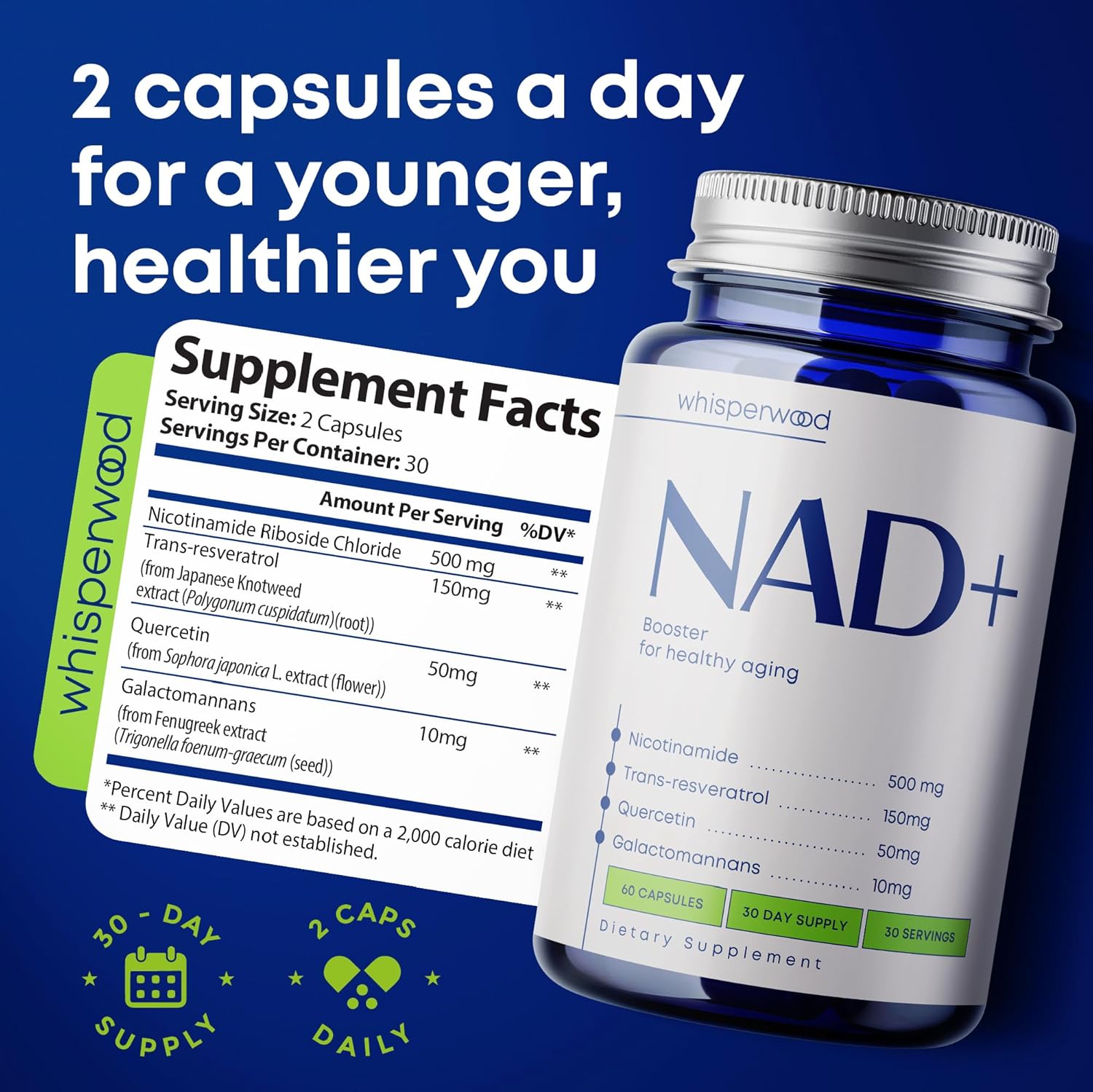 Longevity & Mitochondrial Supplement – The longevity supplement deliver NR, transresveratrol, and galactomannans — a stable capsule alternative to typical NAD liquid supplement formats. Featuring the NMN precursor pathway through Niacinamide, this clean NAD Plus formulation supports mitochondrial balance, sustained vitality, and natural daily energy generation.