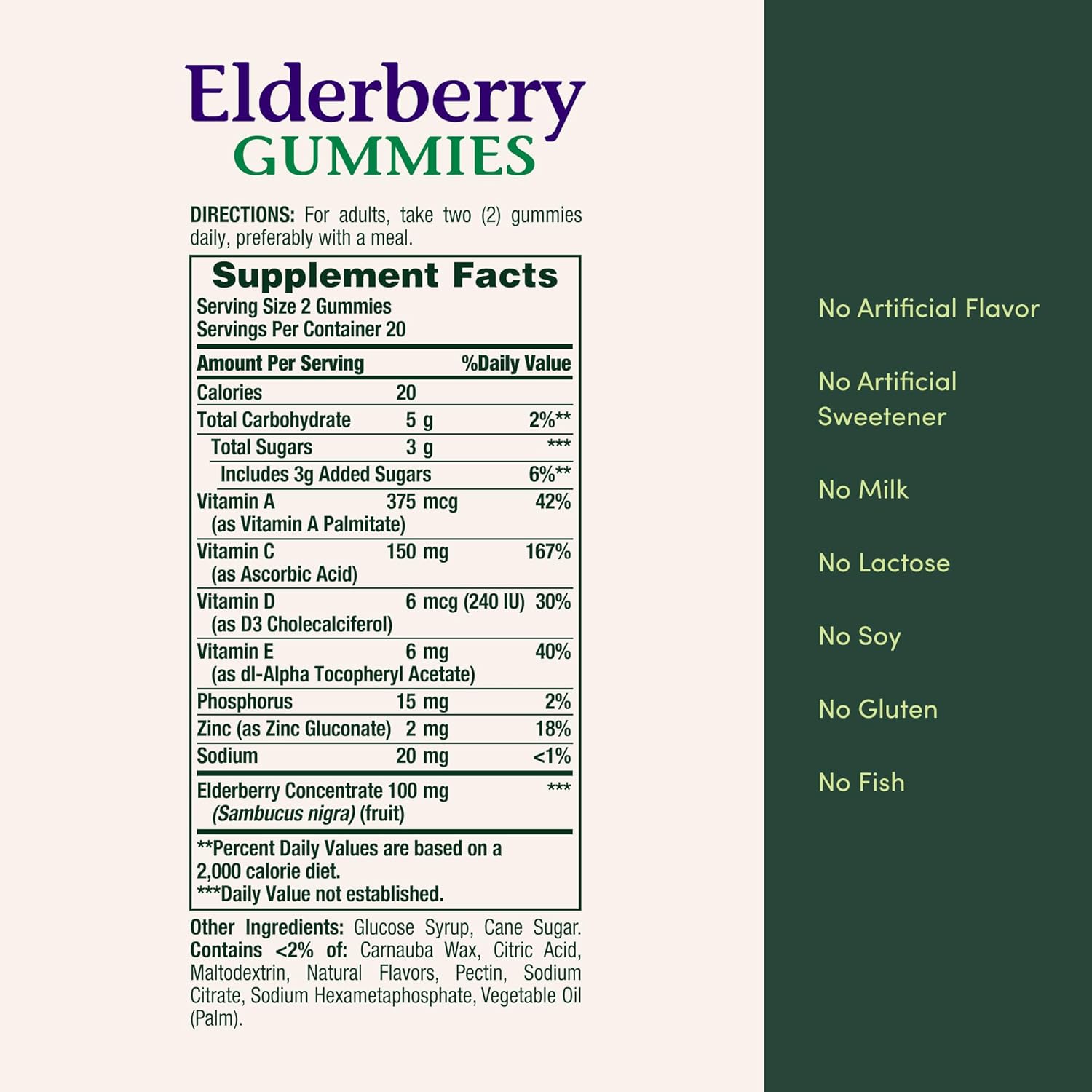 ELDERBERRY GUMMIES WITH ZINC AND VITAMIN C D E AND A: Each serving contains 100 mg Elderberry Extract Sambucus nigra which is 167% of the recommended daily value of Vitamin C and other essential nutrients to support immune system and overall health (1)
