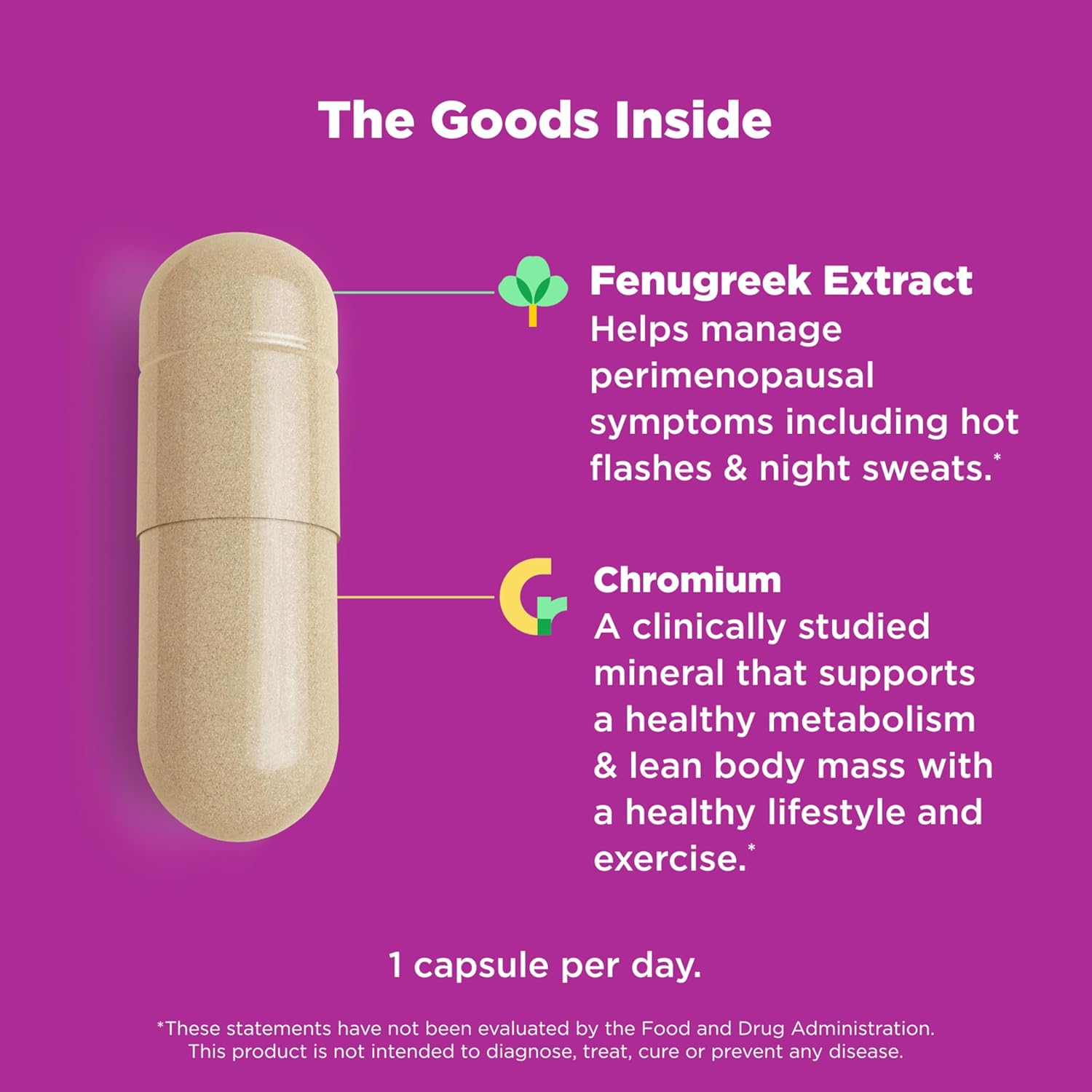 THE GOODS INSIDE: During perimenopause, estrogen levels fluctuate and can leave you feeling out of sync. Fenugreek Extract supports a healthy balance of estrogen levels & mood and helps manage hot flashes & night sweats*