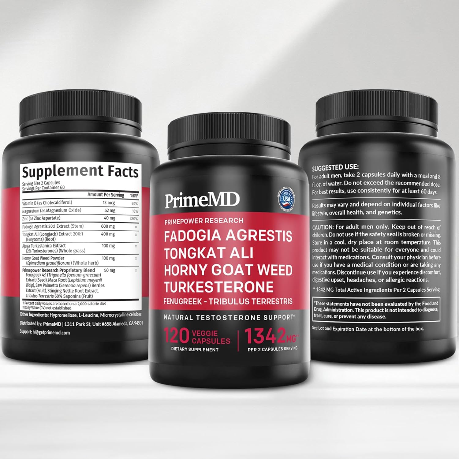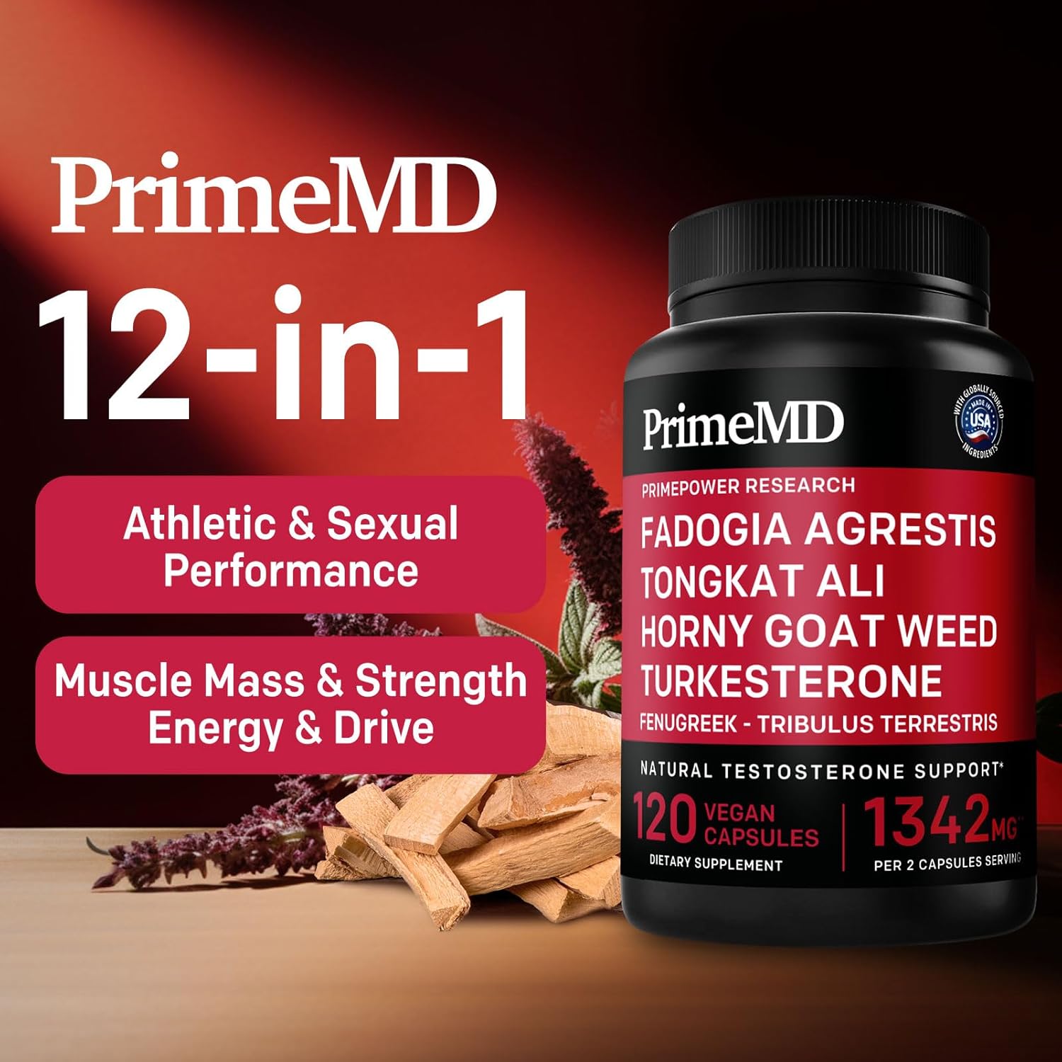 PrimeMD 12-in-1 Fadogia Agrestis and Tongkat Ali – Testosterone Supplement for Men with Turkesterone – HornyGoatWeed for Men for Overall Well-Being with 1342mg Per Serving (120 Capsules) (Pack of 1)