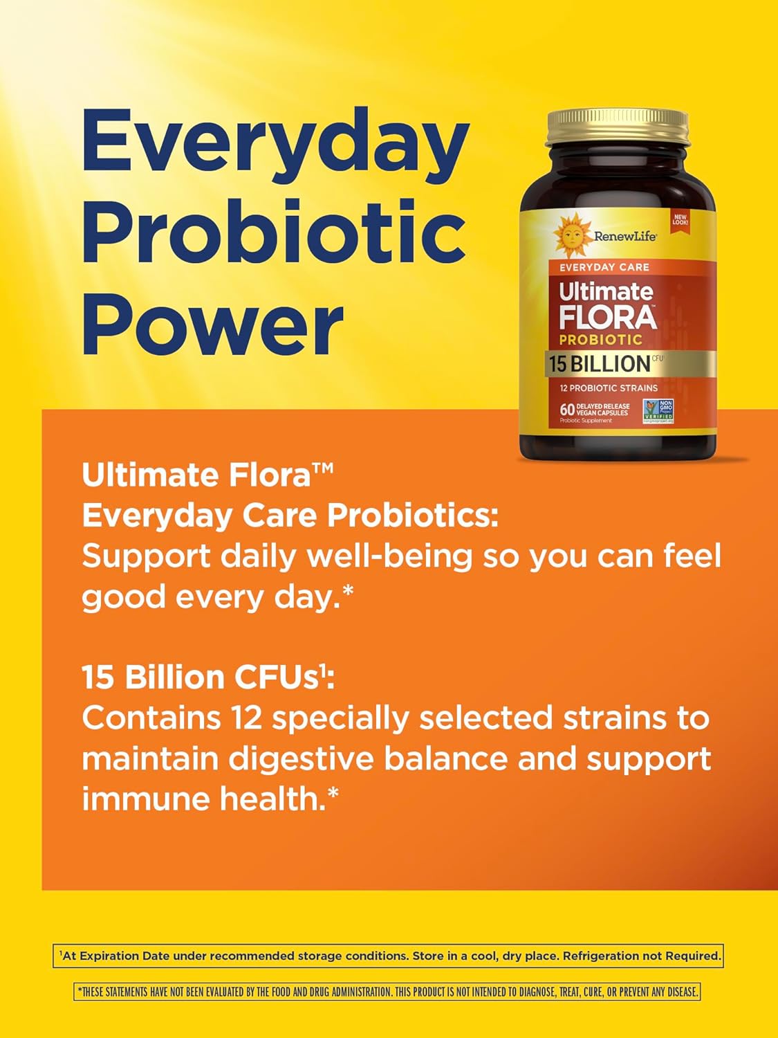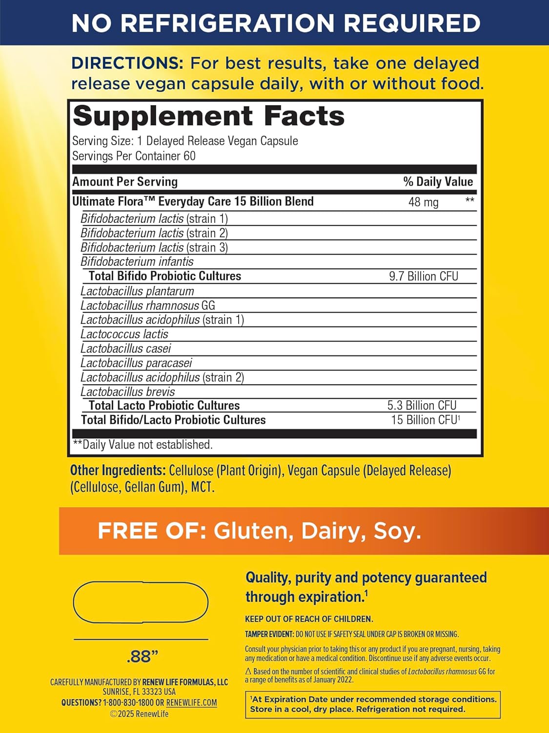 Renew Life Everyday Probiotic offers 12 probiotic strains in small, easy-to-swallow capsules to support digestive health and provide daily immune support (1). Featuring more clinically studied strains than the leading brand, this Renew Life probiotic supplement is formulated to help you feel your best every day (2). These men’s and women’s probiotic pills contain 12 different probiotic strains including L. rhamnosus GG, the No. 1 most studied strain (3). With 15 billion cultures, these probiotic capsules make it easy for you to support your digestive and immune health. Each strain is clinically tested and formulated by microbiologists and researchers to offer science-backed health benefits you can enjoy every day. Potency, quality and purity are guaranteed through the expiration date. This daily probiotic supplement offers a Non-GMO Project Verified formula that is gluten-free, dairy-free and soy-free. Renew Life puts health and wellness first with supplements that are backed by over 25 years of clinical trials. (1) These statements have not been evaluated by the Food and Drug Administration. This product is not intended to diagnose, treat, cure or prevent any disease. (2) Based on IRI unit sales data, January 2021. (3) L. rhamnosus GG strain, PubMed Clinical Trials, August 2019.
