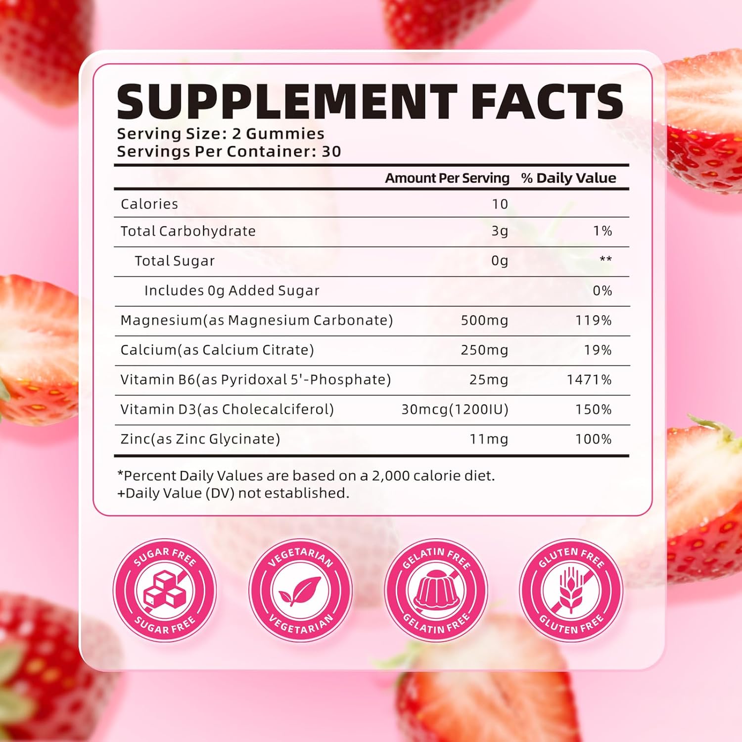Sugar-Free Formula: With natural strawberry flavor, these sugar free magnesium gummies offer a guilt-free, vegan treat; organic magnesium carbonate ensures pure, easy absorption without synthetic additives.