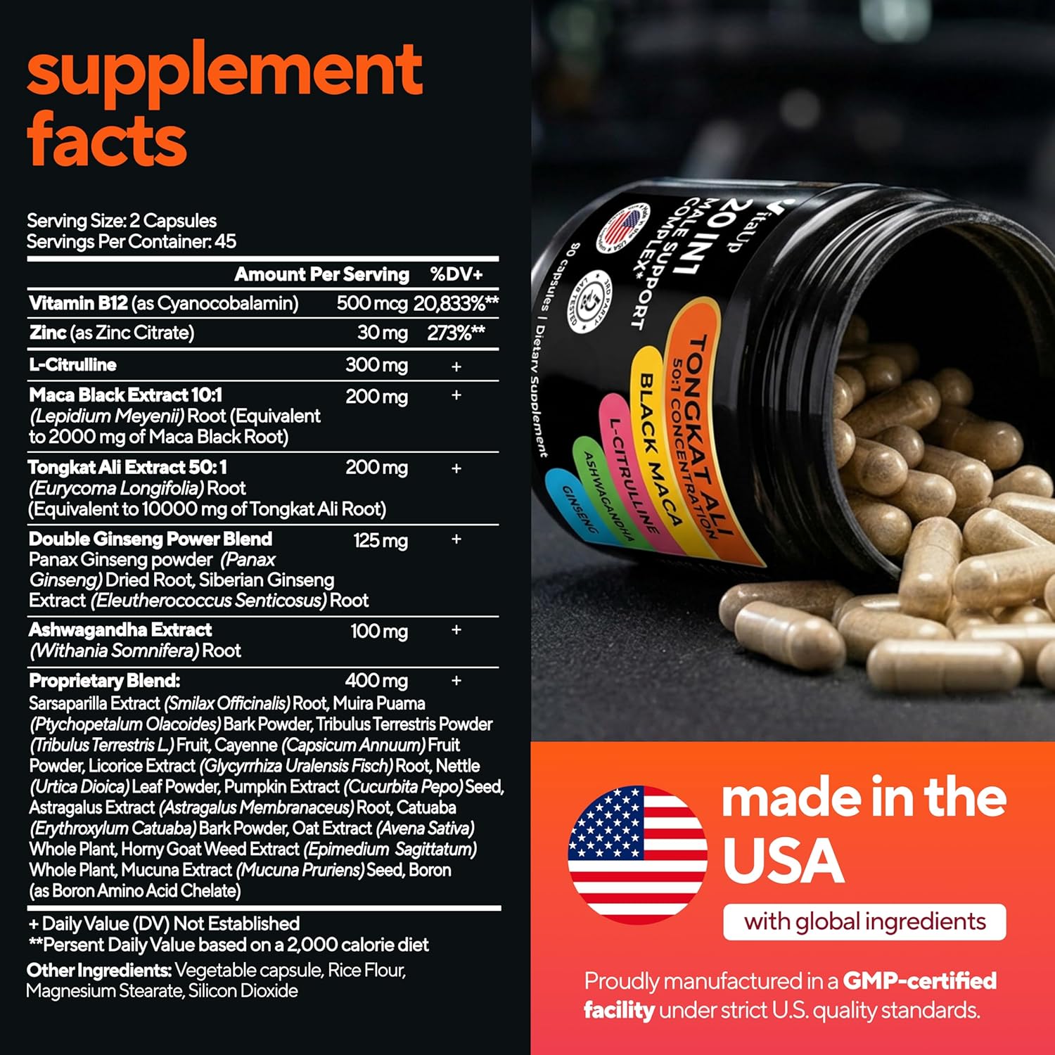 20 IN 1 MALE COMPLEX: VitaUp’s tongkat ali for men provides 1,355 mg of 20 key ingredients. With tongkat ali extract, black maca root, vitamin B12, L-citrulline, panax ginseng, and zinc, our formula is designed to support normal men’s wellness and vitality with just two capsules daily.*