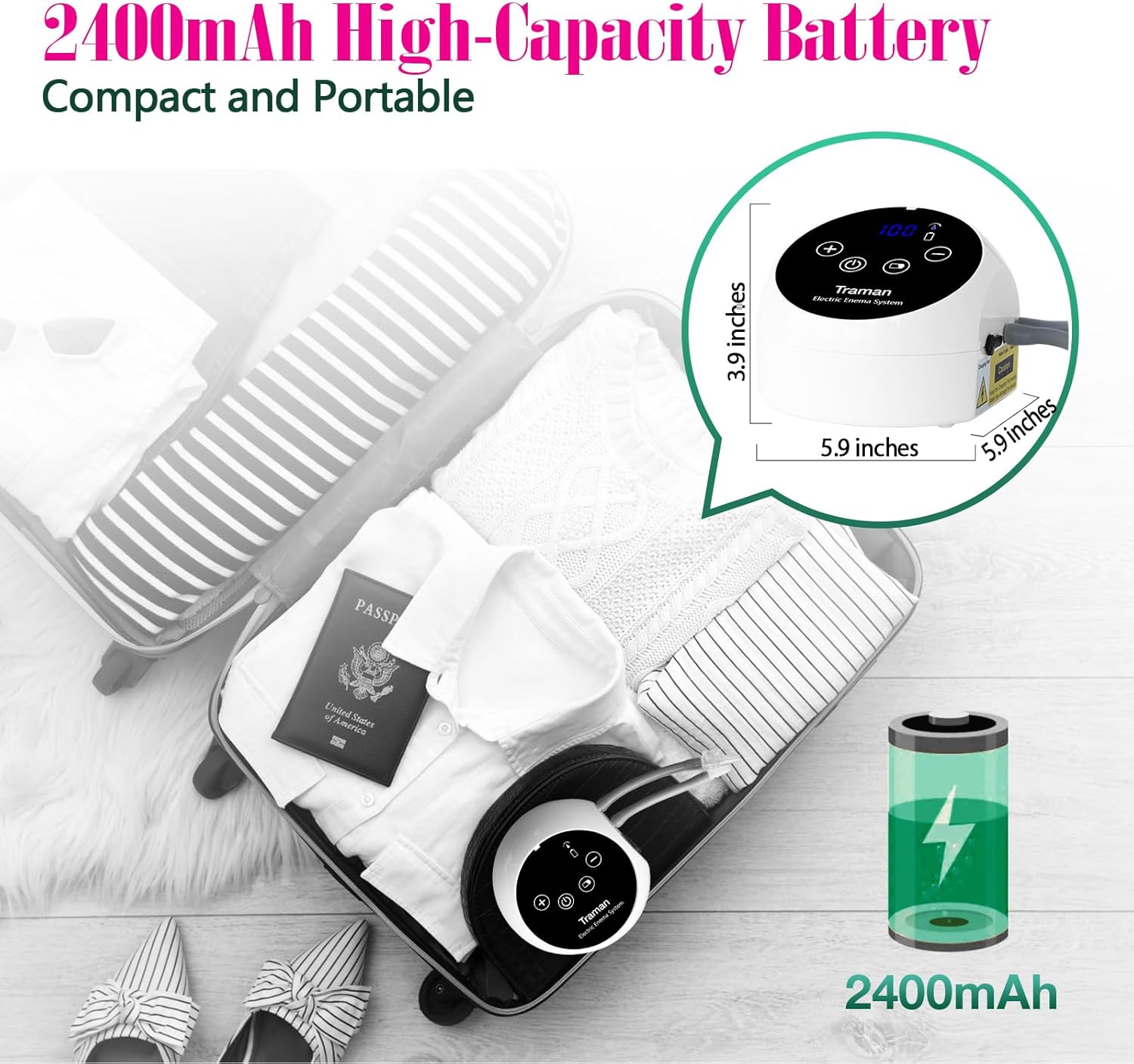 Large Capacity Battery & Portable Design:This electric enema kit has a built-in 2400mAh rechargeable battery that provides long standby time. It comes with a memory function, low battery warning, battery management system, and an emergency stop switch. Its compact size (5.51 × 5.51 × 3.94 inches) and lightweight design (1.32 lbs) make it highly portable and easy to store, even in small spaces.