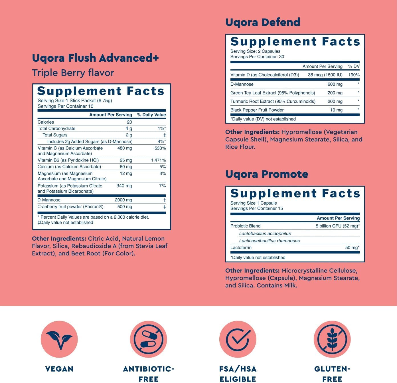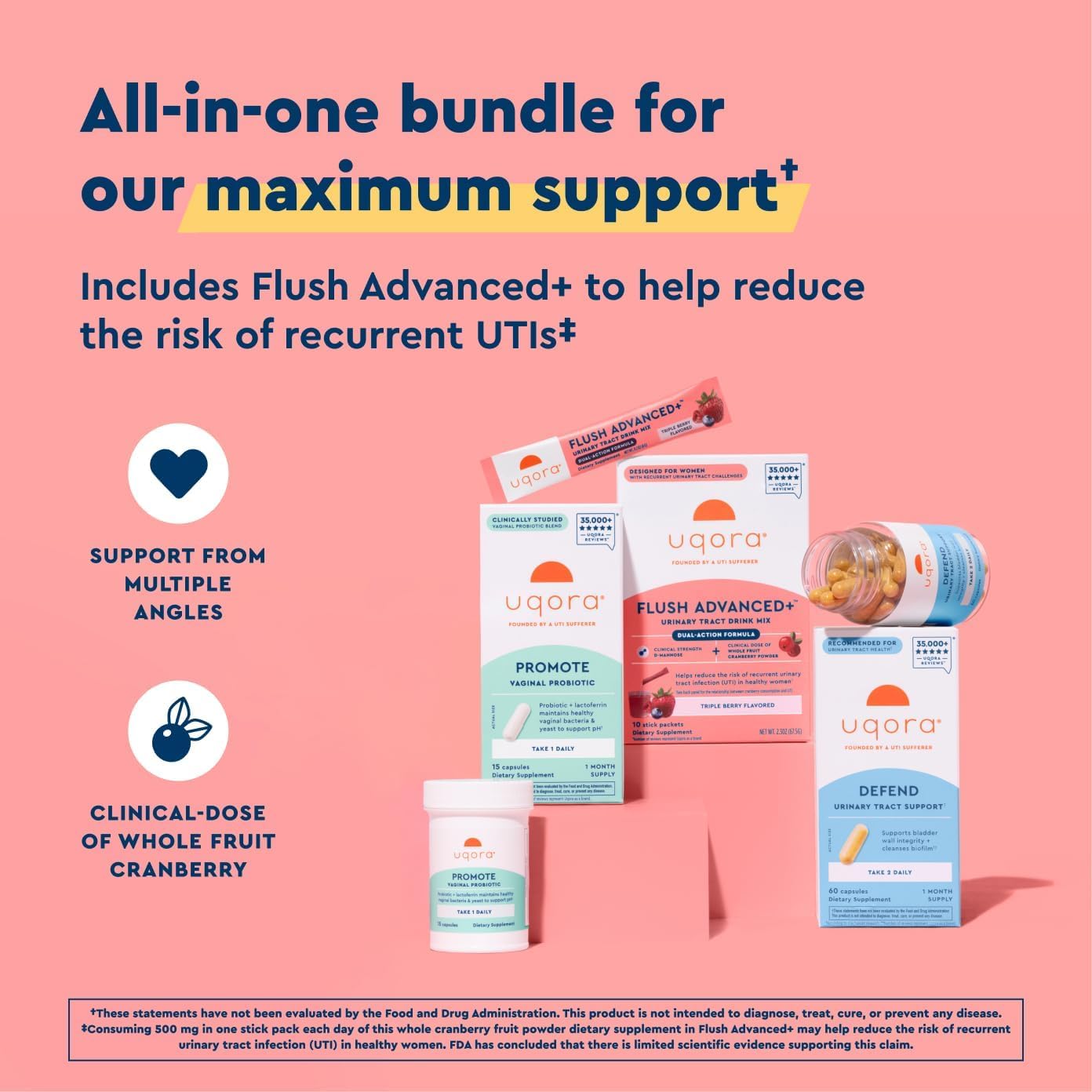 The Flush Advanced+ Regimen combines whole fruit cranberry powder, clinical-strength D-mannose, Vitamin D3 for ongoing bladder support, and a vaginal probiotic for vaginal health support. Together, these products work in complementary ways to support your urinary tract as part of a simple, proactive urinary tract health.†