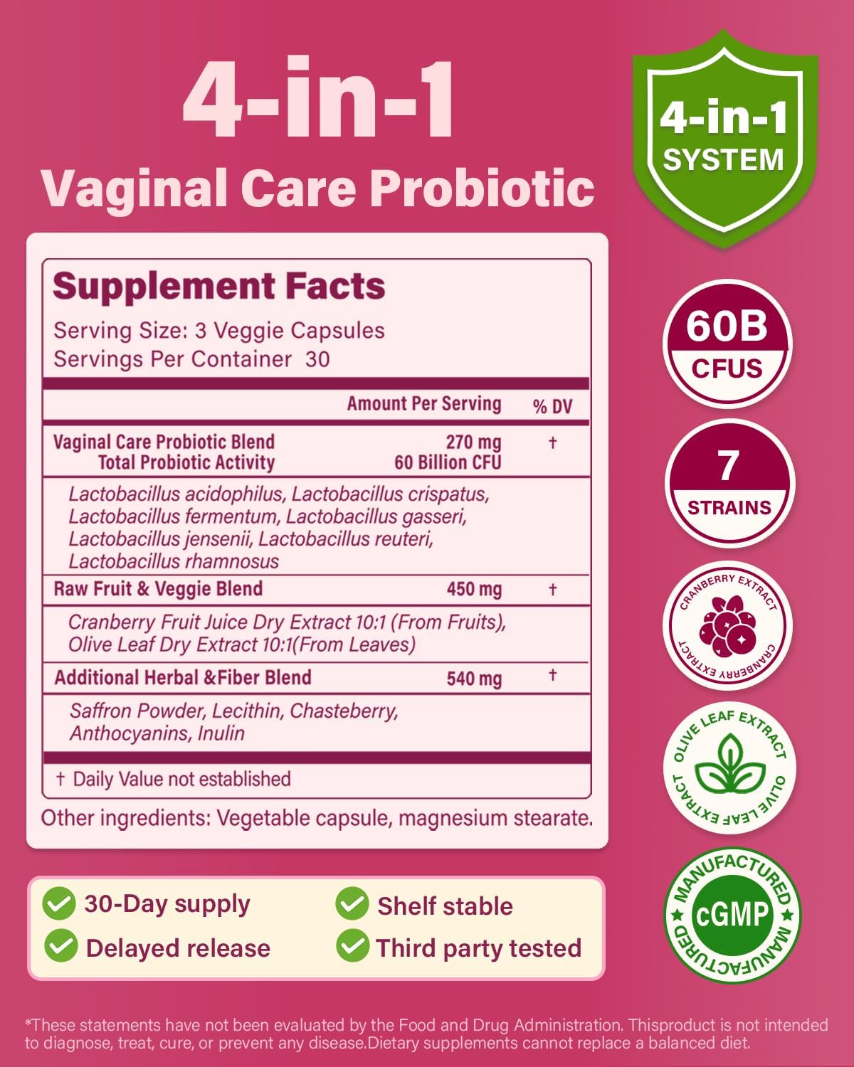 Complete 4-IN-1 Formula : This vaginal formula blends probiotics, prebiotics, herbs, and hormonal support to promote total feminine balance. Probiotics help restore healthy flora and pH Balance, while inulin enhances their activity for lasting results. Cranberry support urinary health, while saffron and chasteberry help balance hormones and mood. Made in a GMP-certified facility and third-party tested, Non-GMO ingredients—free from gluten, dairy.
