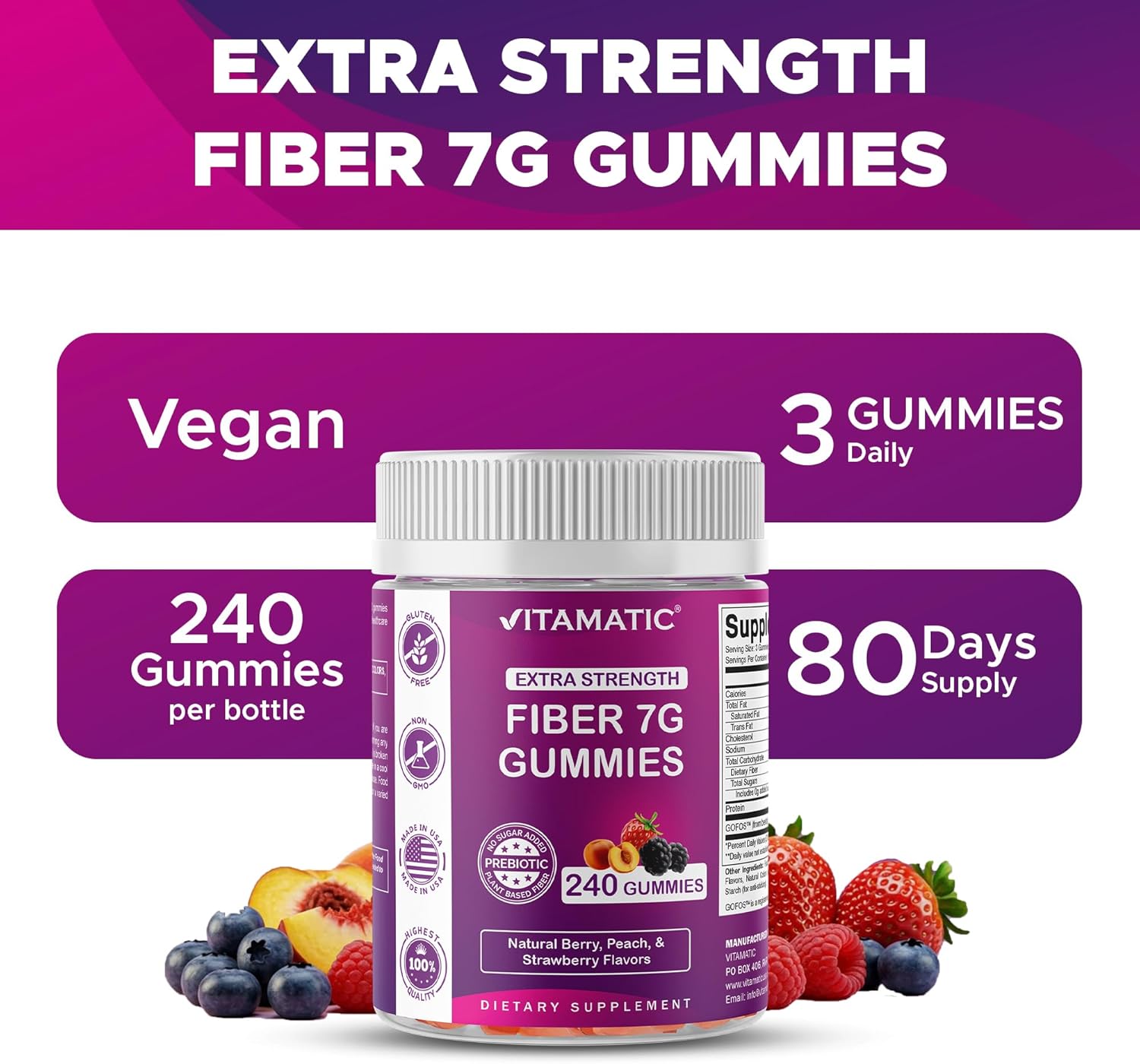 Vitamatic Prebiotic Fiber Gummies for Adults, 7G Extra Strength, Zero Sugar Added, 240 Pectin Based Gummies, Digestive Health & Regularity Support