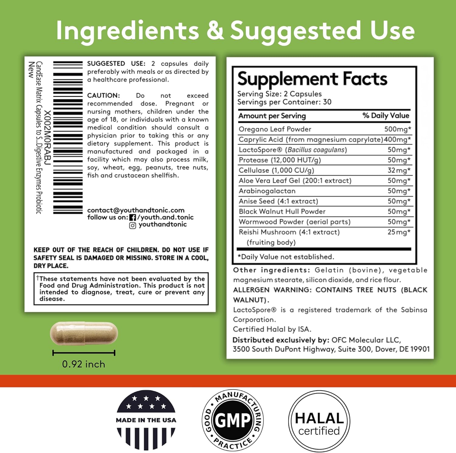 Youth & Tonic CandEase Cleanse Matrix – Overgrowth Support & Gut Health, Intestinal Flora Balance & Body Detox Complex with Oregano, Caprylic Acid, Digestive Enzymes, Probiotics, 60 Pills, Women & Men